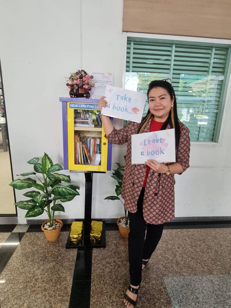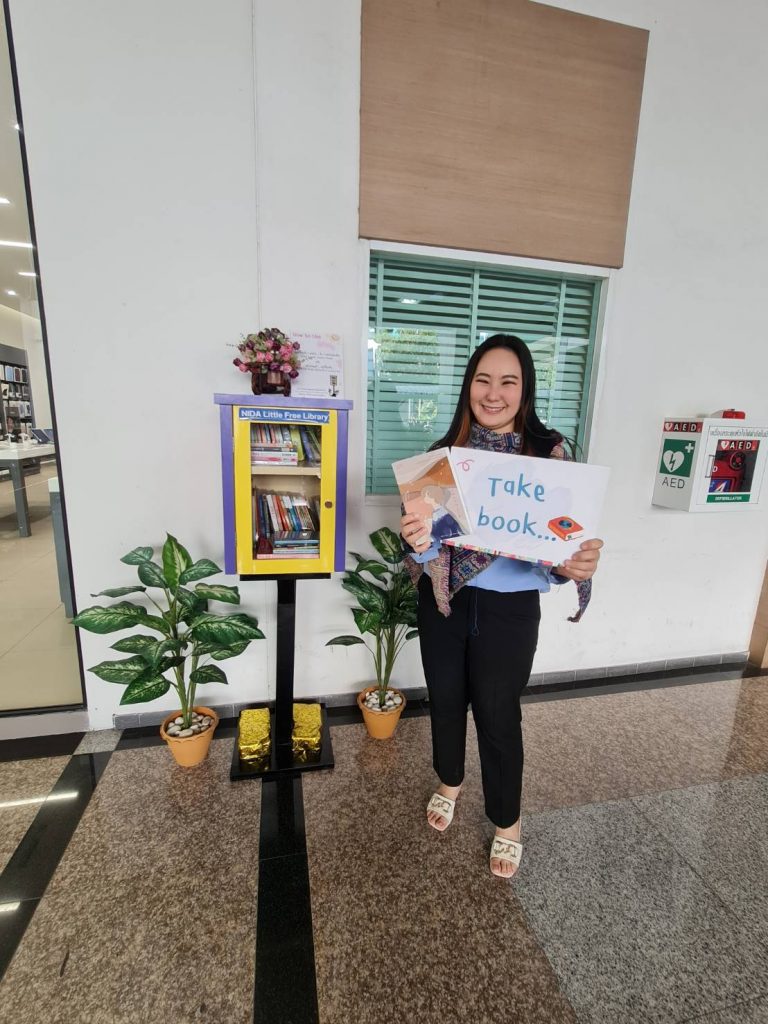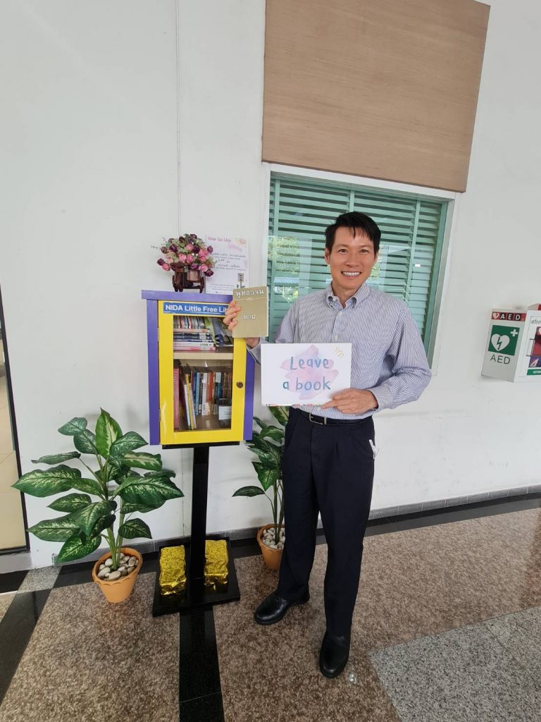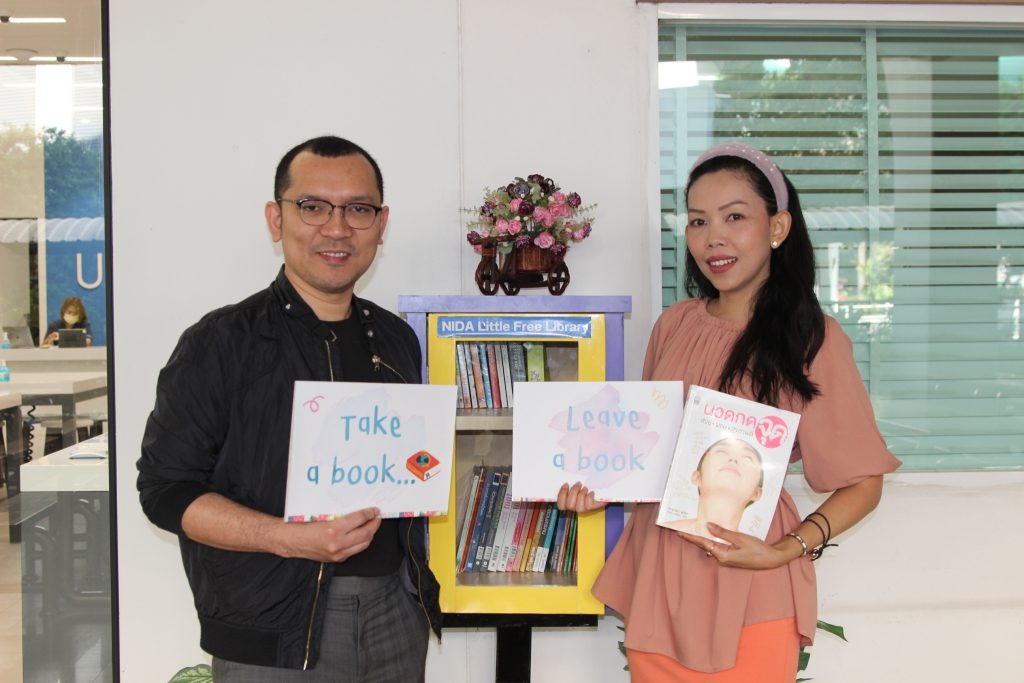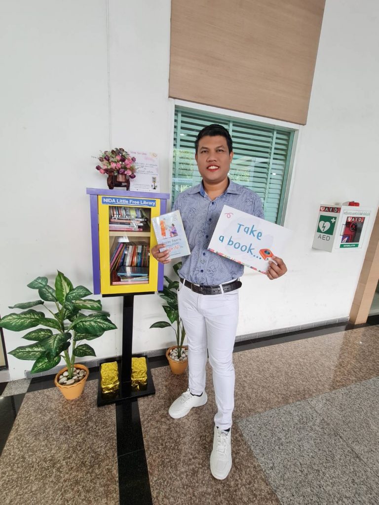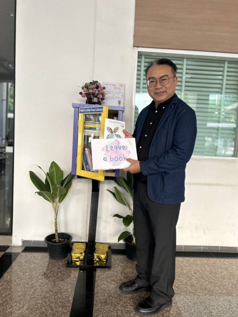 ภาพกิจกรรม 8 มกราคม 2567 : สำนักบรรณสารการพัฒนาจัดกิจกรรม “เปิดตู้ปันอ่าน (NIDA Little Free Library)” Take a Book … Leave a Book หยิบ 1 เล่มไป … นำ 1 เล่มใหม่มาคืน เพื่อแบ่งปันพื้นที่การเรียนรู้แก่ชุมชน และส่งเสริมให้เกิดการเรียนรู้ตลอดชีวิต (Lifelong Learning) นำทีมปันอ่านโดย รศ.ดร.ปราโมทย์ กั่วเจริญ ผู้อำนวยการสำนักบรรณสารการพัฒนา และมีชาวนิด้าร่วมกิจกรรมมากมาย โดยตู้ปันอ่านจะตั้งอยู่ ณ อาคารชุบ กาญจนประภากร ปันสุขโดย สำนักบรรณสารการพัฒนา