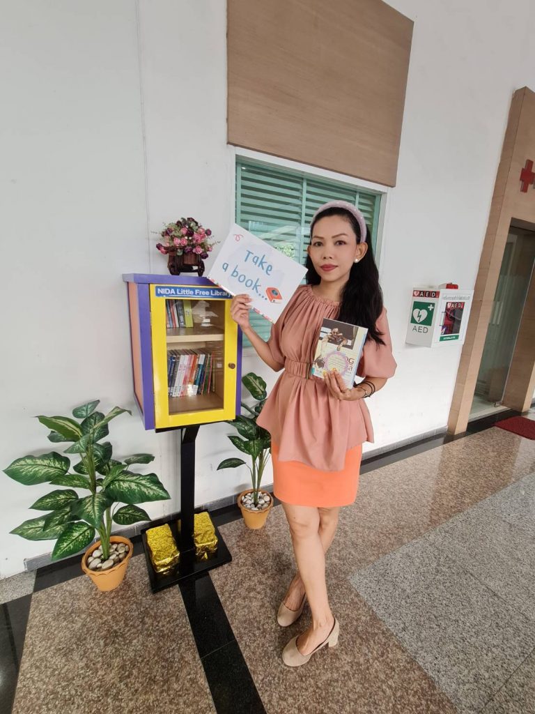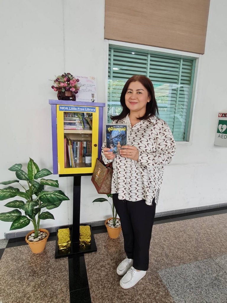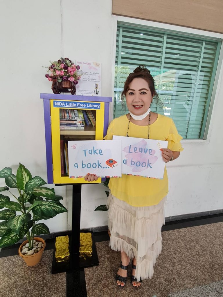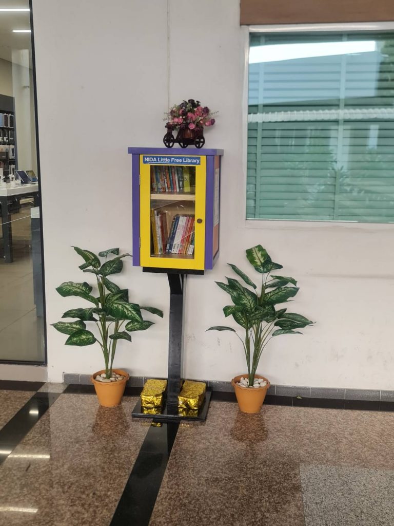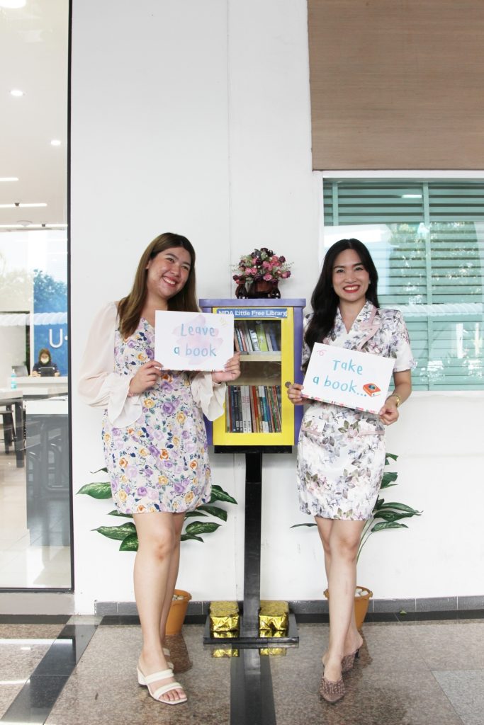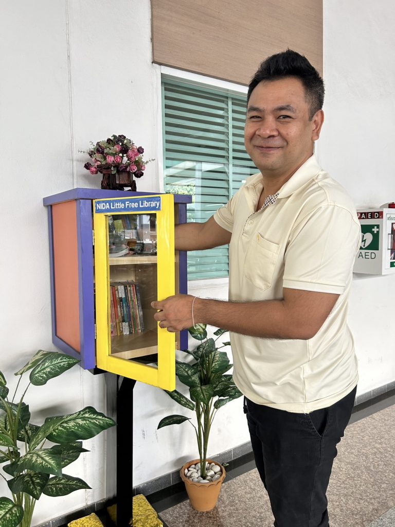 ภาพกิจกรรม 8 มกราคม 2567 : สำนักบรรณสารการพัฒนาจัดกิจกรรม “เปิดตู้ปันอ่าน (NIDA Little Free Library)” Take a Book … Leave a Book หยิบ 1 เล่มไป … นำ 1 เล่มใหม่มาคืน เพื่อแบ่งปันพื้นที่การเรียนรู้แก่ชุมชน และส่งเสริมให้เกิดการเรียนรู้ตลอดชีวิต (Lifelong Learning) นำทีมปันอ่านโดย รศ.ดร.ปราโมทย์ กั่วเจริญ ผู้อำนวยการสำนักบรรณสารการพัฒนา และมีชาวนิด้าร่วมกิจกรรมมากมาย โดยตู้ปันอ่านจะตั้งอยู่ ณ อาคารชุบ กาญจนประภากร ปันสุขโดย สำนักบรรณสารการพัฒนา