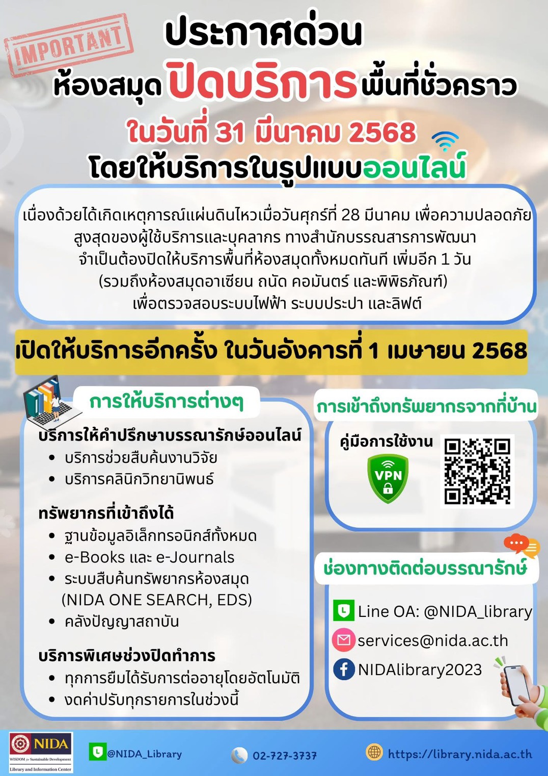 ประกาศด่วน ห้องสมุดปิดบริการพื้นที่ชั่วคราว